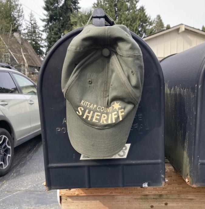 This morning, I noticed an olive-green ball cap hanging from the latch on my neighbor’s mailbox (see photo). Because a ball cap can be part of the standard uniform worn by Kitsap County sheriff’s deputies, it made me wonder how the cap and its owner got separated and also hope nothing serious happened in the process.