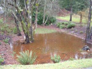A couple of summers ago the property owners landscaped the area. They cleared out the underbrush, planted grass in the low spot, and added a bench and a few shrubs and ferns along their driveway. The next winter the area seemed to drain better and the pond was never more than a large puddle. But for now it’s back, at least until the weather changes.