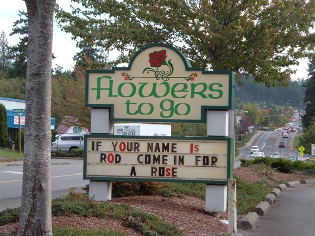 Flowers to Go, a florist with several stores in Kitsap County, hands out a free rose to anyone whose name is on their sign that day. Like the people who assign names to hurricanes, they alternate between girls and boys. This morning when I was in Silverdale buying paint I noticed that the sign on the local Flowers to Go said to come in for a rose if your name is Rod (see photo). So I did. A nice blonde lady named Julie gave me a pink long-stemmed rose. She didn’t even ask for an ID. Perhaps I should have done more shopping today. I had a great response if anyone had asked me how my day was going.