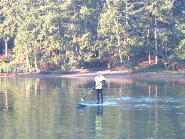 G.M., the man I talked to, works at Boeing and takes his paddleboard out on weekends. He referred to it as a SUP (for stand up paddleboard). About the length of a longboard, his SUP is a bit wider than a traditional surfboard. It has a nonskid area near the back and a 10-inch skeg. So it will go just about anywhere in Dyes Inlet no matter what the tide. On a typical outing G.M. starts out from his home on Marine Drive, paddles around the point and into Ostrich Bay, and then all the way back. Even in a full wetsuit, that has to be a cold trip. Brrr.