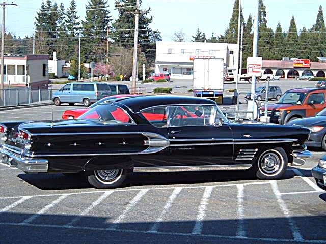 I have posted two previous entries about a black 1958 Pontiac seen occasionally around Bremerton. The first, almost two years ago, observed that spring is the time to start thinking again about collector cars. Last September a second post confirmed that the car and its owner live on Rocky Point. But until now, you had to take my word that the two-door Bonneville is flat-out gorgeous. The photo shown above was taken this afternoon at the QFC just before I went inside. By the time I finished shopping, the car was gone.