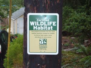 Is your property a certified wildlife habitat? A home on Rocky Point that I pass by on walks and bike rides proudly displays a sign that it qualifies (see photo). Their sign made me wonder how many of the basic habitat elements (food, water, cover, and places to raise young) my property provides. Also whether owning the Mud Cat, a stealthy but rarely successful stalker of songbirds and rodents, is a no-no.