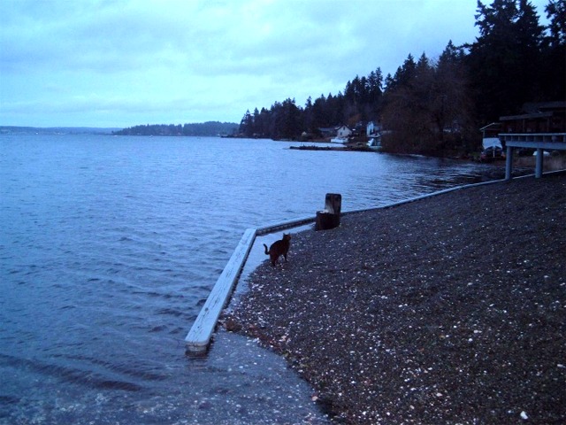 Posting a King Tide photo is becoming an annual event for the Mud Bay blog. This is my third. The picture was taken at the north end of Mud Bay a few minutes before this morning’s official high tide (7:45 AM, 13.6 feet). I don’t have a GPS so I can’t be more specific on location. The small bulkhead provides a rough yardstick for measuring the water’s height. It’s rare to see water on its land side.