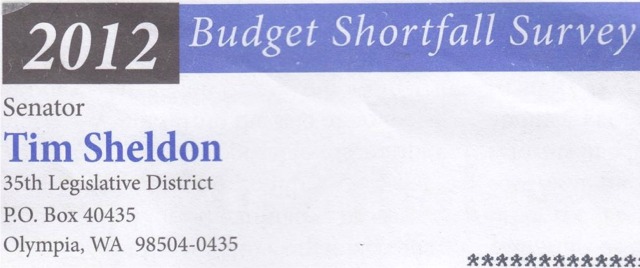 Senator Tim Sheldon (Democrat-Potlatch) represents Washington’s 35th legislative district in the state senate. He’s also holds a full-time elected post as a Mason County Commissioner. The legislative survey from Senator Sheldon that I got in the mail yesterday made me wonder if he is on top of things.
