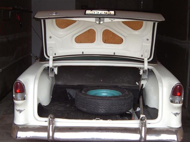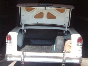 The previous owner of my car outfitted it with the widest steel-belted radial tires he could find. It’s on my list to replace them someday due to their age, but when you only drive 500 miles per year, buying 40,000-mile tires is a low priority. Although the spare that came with the car was one size narrower, it still didn’t fit in the trunk’s spare tire well. It seemed to take up most of the trunk and gave it a cluttered look (see photo). This week I replaced the spare with a used radial tire from Quality Tires in Belfair, dropping down one more width to 205-75R-15. This one fits in the spare tire well and makes the trunk interior look somewhat like the car’s designers intended (see photo). That’s if you ignore the fact that back then cars rode on narrow bias-ply tires. For 1955 passenger cars like mine, Chevy specified a tire size of 6.70×15. When I do get new tires, I plan to match the size of the new spare all the way around. I like the narrower look even if it means possibly having to get the speedometer recalibrated. It’s not a good idea to have a spare that’s two sizes off from the rest of the tires, but this one will do until then.