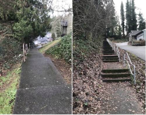 By contrast, the area around the bottom of the stairs is residential, primarily single family houses plus the Bay Pointe Retirement Community. It’s not the kind of neighborhood that produces a lot of walkers, although it’s quite possible locals know the stairs exist. But whether many people in the Lower Marine Drive area use them to walk up to Kitsap Way is an open question.