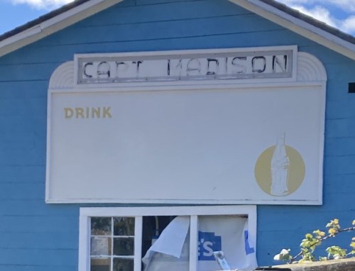 The sign is about 6 feet by 9 feet. “CAPT MADISON” and “DRINK” are the only words on it, although there’s a drawing of either a soda or beer bottle in the lower right corner. The rest of the sign is empty, almost like additional advertising still needs to be painted on. If so, it’s been a long wait. My guess is that the sign is from the mid-20th century.