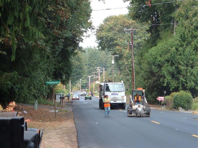 Today a crew from Kitsap County Public Works installed road reflectors in the recently paved section of Rocky Point Road. Although the process is labor intensive (see photo), when the crew is working in sync they can install the reflectors quickly.