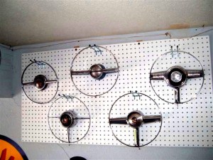Automobile horn rings date back to the days of heavy exterior chrome, glitzy dashboards, and designers who were more concerned with looks than safety. The rings were functional as well as eye catching—press anywhere on the ring or its center emblem and the slowpoke in front of you instantly knew it was time to get moving. My small collection of horn rings has been in storage since I moved a couple of years ago. Recently I mounted them on a pegboard panel in the garage (see photo).