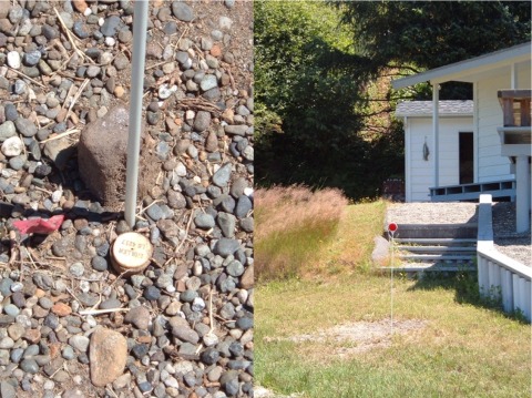 My neighbor to the north, whose large lot fronts on Mud Bay, has long been concerned about identifying the exact location of the line that divides her property from mine and the house just to the east of mine. I used the word “finding” rather than “surveying” in the title because she isn’t a licensed surveyor. But she sails, understands navigation and the use of a GPS, and owns a laser light. She put those skills to work and seems to have done an accurate job. Part of the evidence is that she uncovered a long-buried surveyor’s mark in an area that is underwater during the highest tides (see photo).