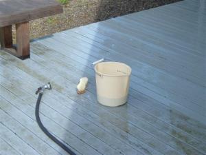It’s been a while since I last cleaned the mildew, algae, and bird droppings off the deck. I thought about trying one of the deck-wash products available at the home improvement stores. According to their directions you just spray on the cleaning solution, wait 10 minutes, and rinse with a hose. In the end out of concern for the environment and a suspicion that no job could be that easy unless the cleaner is mostly bleach, I decided to clean the deck the old-fashioned way—with a scrub brush (see photo).