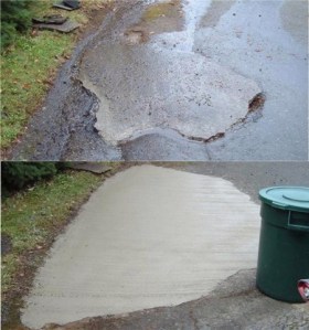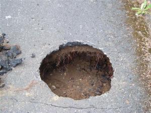 Last September I posted an entry about patching my driveway called The Big Pour. By the amount of cement used, yesterday’s pour was nowhere near as big a job. But the patch covers a far more serious problem (see photo)—one that I hope went away as mysteriously as it appeared.