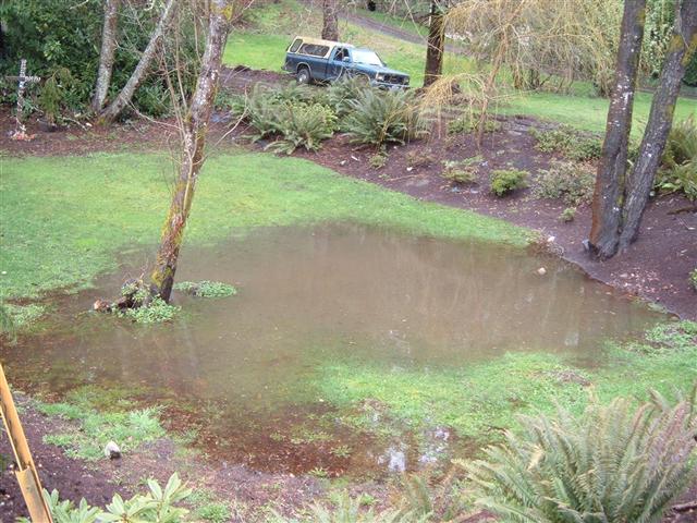 To clarify, it’s not really a pond—just a low spot between two driveways that fills with water after a few days of all-day rain. The address of this informal neighborhood rain gauge is 2609 Rocky Point Road. The pond’s record size—at least in pictures I have posted—was in March 2011.