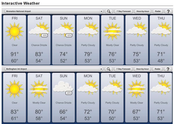 I’m sure it’s hot where you are too, so if you want to dismiss this as just another post by a heat wimp, go ahead. You’ll have even less sympathy when I admit that the extended forecast is for cooling temperatures and a chance of drizzle (see weather graphics above from the Seattle Times). However, it will be HOT today in Bremerton. Stick around if you want to cool off—at least on paper.