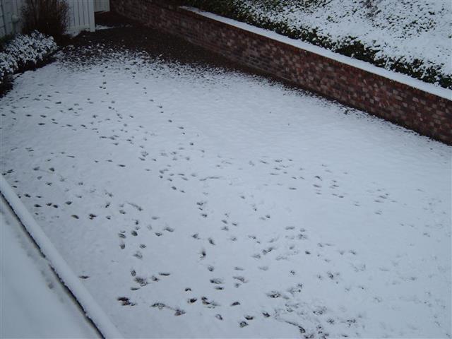 The prints were made by critters, probably raccoons. I don’t get a newspaper, and even if I did, no human would walk down the hill to deliver it to my house. There must have been a good band although I didn’t hear anything (I’m a heavy sleeper). In a few places it looks like the party goers were dancing the two step. The Mud Cat didn’t leave these tracks. His prints are smaller and, well, more cat-like. Besides, he would never date a raccoon.