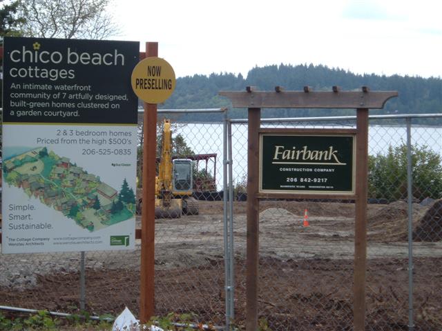 The old sign announcing the Chico Beach Cottages said something like “Coming in Spring 2010” or “Available in Spring 2010.” Construction finally started a couple of weeks ago. The new sign (see photo) doesn’t mention the missed deadline, but a flyer available at the site states that completion is now targeted for Spring 2011. It also advises that only 5 of the 7 homes to be clustered on the roughly 1-acre site, which are priced from the mid-$500s, are left. I learned this on my bike ride today.