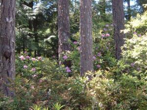 It’s the end of May and coast rhododendrons, Washington’s state flower (Rhododendron macrophyllum), are in full bloom, showing off their attractive pink blossoms (see photo). Perhaps I should refer to them as “native” instead of “wild” rhododendrons, although one web site I consulted said they were imported from California rather than originating in the Evergreen State. Whichever modifier is used, they do quite well without any help from man. No one fertilizes them, prunes the old blossoms, or waters them during our hot dry summers.